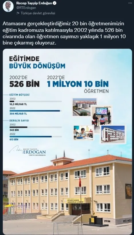 Öğretmenlerimizin sayısını toplamda yaklaşık 1 milyon 10 bine çıkarmış oluyoruz. Ülkeyi yönetme sorumluluğunu üstlendiğimiz 2002 yılında bu sayı 526 bin civarındaydı. Hali hazırda görev yapan öğretmenlerimizin 750 bini bizim zamanımızda atanmıştır. Tabi bu arada emekli olanlar olmuştur fakat 750 bin öğretmeni bu arada biz atadık. Okullarımızdaki alt yapı ve öğretmen eksikliğinden dolayı derslerin çoğu maalesef boş geçiyordu.