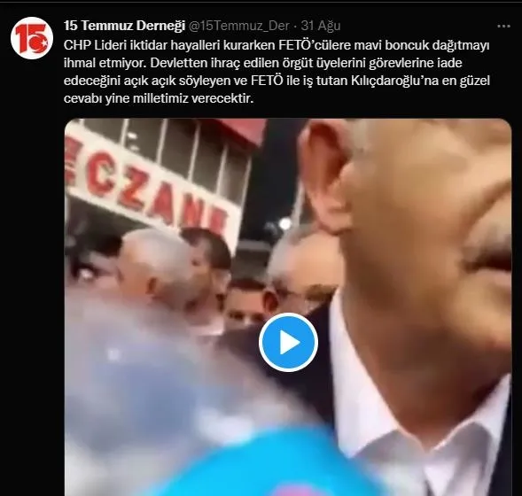 15 TEMMUZ DERNEĞİ: CHP Lideri iktidar hayalleri kurarken FETÖ'cülere mavi boncuk dağıtmayı ihmal etmiyor. Kılıçdaroğlu'na en güzel cevabı yine milletimiz verecektir.