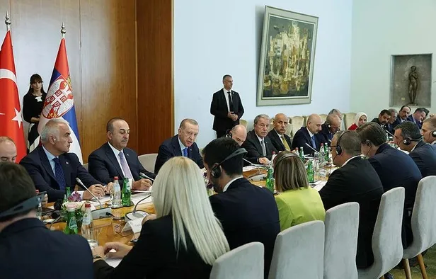 Son dakika haberi! Başkan Erdoğan, Balkan turunun ilk durağı olan Bosna Hersek'teki temaslarını tamamlayarak ikinci durağı olan Sırbistan'a geçti. Başkan Erdoğan, Sırbistan Cumhurbaşkanı Aleksandar Vucic tarafından resmi törenle karşılandı. Erdoğan ve Vucic baş başa görüştü. Kritik görüşme sonrası iki ülke arasında 7 mutabakat zaptı imzalandı. İki ülke arasında ortak ticaret hacminin 5 milyar dolara çıkarılması hedeflendiğini belirten Erdoğan, "Kimlikle seyahat konusunda az önce imzalanan protokol ilişkilerimizi yeni bir seviyeye çıkaracaktır." dedi. Batı'nın Rusya'ya karşı yanlış bir politika izlediğini belirten Erdoğan, "Rusya hafife alınacak bir ülke değil. Rusya doğal gazı kesti fiyatlar Avrupa'da bir anda yükseldi. Şimdi kara kara düşünüyorlar bunları daha önceden düşünmeniz gerekiyordu." ifadelerini kullandı.