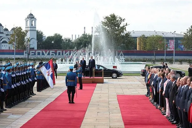 Başkan Erdoğan'ı, Sırbistan Cumhurbaşkanlığı Sarayı'nda Sırbistan Cumhurbaşkanı Vucic karşıladı. İki ülke milli marşları okunurken 7 pare top atışı yapıldı.
