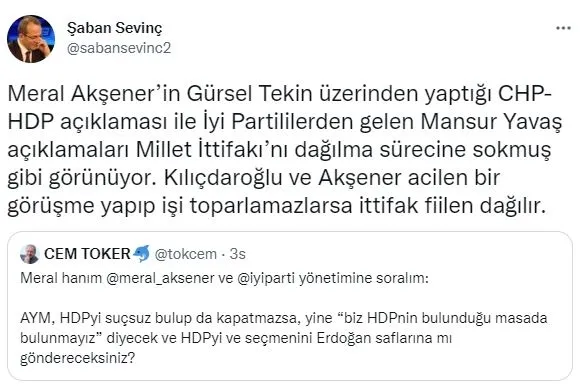 Muhalif gazetecilerden biri de Şaban Sevinç. Sevinç de tıpkı Nevşin Mengü gibi 6'lı masanın dağılacağını düşünenlerden. Sosyal medyada paylaşımda bulunan Sevinç, "Meral Akşener'in Gürsel Tekin üzerinden yaptığı CHP-HDP açıklaması ile İyi Partililerden gelen Mansur Yavaş açıklamaları Millet İttifakı'nı dağılma sürecine sokmuş gibi görünüyor. Kılıçdaroğlu ve Akşener acilen bir görüşme yapıp işi toparlamazlarsa ittifak fiilen dağılır" ifadelerini kullandı.
