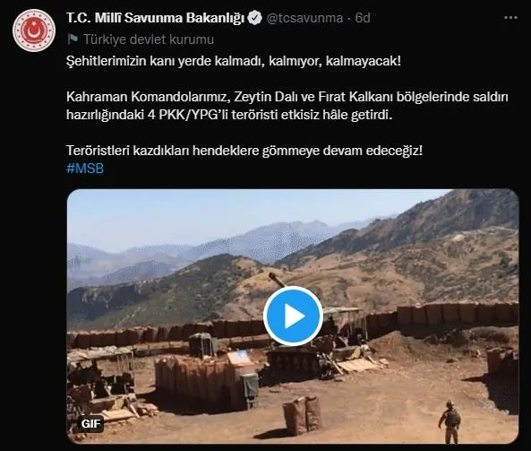 Milli Savunma Bakanlığı, Zeytin Dalı ve Fırat Kalkanı bölgelerinde saldırı hazırlığındaki 4 PKK/YPG'li terörist etkisiz hale getirildiğini bildirdi.