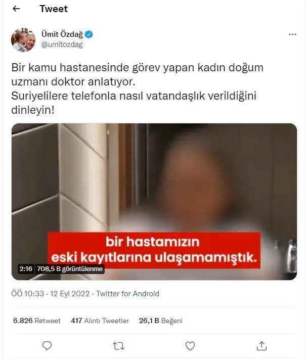 Özdağ son olarak sosyal medya hesabı Twitter üzerinden provokasyona soyundu ve "Suriyelilere telefonla vatandaşlık veriliyor" yalanını dolaşıma soktu.