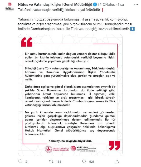 "Daha önce açıkça ve görsel olarak işlem aşamalarının ayrıntılı bir şekilde Sayın Bakanımız tarafından da ifade edildiği gibi yabancının bizzat başvuruda bulunması, il aşaması, valilik komisyonu, tahkikat ve arşiv araştırması gibi birçok sürecin olumlu sonuçlandırılması halinde Cumhurbaşkanı kararı ile Türk vatandaşlığı kazanılabilmektedir.Ne yazık ki ısrarla resmi açıklamaları ve verileri görmezden gelerek hiçbir gerçekliğe dayandırılmadan gündeme gelmek adına içerikler oluşturulmaya devam edilmektedir.