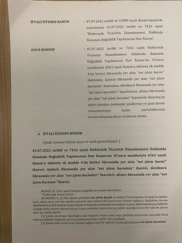 Cumuriyet Halk Partisi, TBMM'de kendilerinin de oyuyla kabul edilen e- Ticaret kanununun bazı maddelerinin iptal edilmesi için Anayasa Mahkemesi'ne başvurdu.