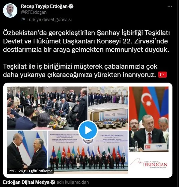 BAŞKAN ERDOĞAN'DAN ŞANGHAY İŞBİRLİĞİ ÖRGÜTÜ ZİRVESİ'NE İLİŞKİN PAYLAŞIM