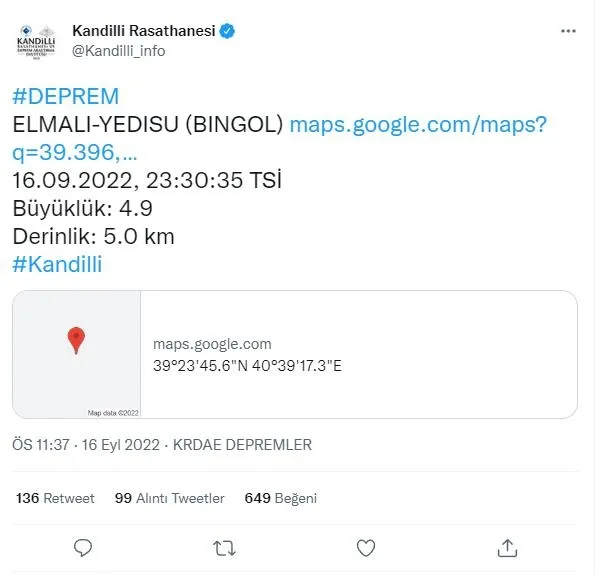 2022.09.16 23:30:35 39.3960 40.6548 5.0 -.- 4.9 4.9 ELMALI-YEDISU (BINGOL) İlksel 2022.09.16 20:58:18 36.0445 27.6148 5.4 -.- 3.1 3.1 AKDENIZ İlksel 2022.09.16 20:26:18 37.9428 43.4457 12.2 -.- 2.4 -.- DIKBIYIK-GURPINAR (VAN) İlksel 2022.09.16 18:25:27 38.6345 39.4155 8.1 -.- 2.1 -.- YENIKAPI-(ELAZIG) İlksel 2022.09.16 17:53:35 36.2412 33.7405 0.0 -.- 1.1 -.- AKDERE-SILIFKE (MERSIN) İlksel 2022.09.16 16:30:27 36.7262 37.1607 23.6 -.- 1.8 -.- BESIKKAYA-(KILIS) İlksel 2022.09.16 16:07:49 40.8330 31.3583 9.5 -.- 1.9 -.- SARICOKEK-KAYNASLI (DUZCE) İlksel 2022.09.16 15:36:15 36.1252 33.5240 0.0 -.- 1.3 -.- YANISLI-GULNAR (MERSIN) İlksel 2022.09.16 15:32:05 35.4087 32.4330 2.9 -.- 2.2 -.- AKDENIZ İlksel 2022.09.16 15:25:12 39.3785 40.6318 8.1 -.- 2.7 -.- ELMALI-YEDISU (BINGOL) REVIZE01 2022.09.16 14:41:06 39.5257 29.2538 10.0 -.- 1.7 -.- KISLADEMIRLI-TAVSANLI (KUTAHYA) İlksel 2022.09.16 14:13:26 34.9662 26.1713 10.2 -.- 2.3 -.- GIRIT ADASI ACIKLARI (AKDENIZ) İlksel 2022.09.16 14:11:58 36.7543 29.9368 1.2 -.- 1.3 -.- GOKPINAR-ELMALI (ANTALYA) İlksel 2022.09.16 14:09:07 37.5975 33.6320 9.4 -.- 1.9 -.- KAVUKLAR-AYRANCI (KARAMAN) İlksel 2022.09.16 14:01:18 39.0528 37.3605 0.0 -.- 2.0 -.- SEKERPINAR-KANGAL (SIVAS) İlksel 2022.09.16 13:48:44 36.1940 33.6955 0.0 -.- 0.9 -.- YESILOVACIK-SILIFKE (MERSIN) İlksel 2022.09.16 13:48:30 36.1903 33.7025 0.0 -.- 1.2 -.- YESILOVACIK-SILIFKE (MERSIN) İlksel 2022.09.16 13:21:57 38.3158 31.8993 27.3 -.- 1.4 -.- GEDIKOREN-ILGIN (KONYA) İlksel 2022.09.16 13:13:00 40.8628 40.5558 25.8 -.- 2.0 -.- GUZELYURT-(RIZE) İlksel 2022.09.16 13:07:44 36.7733 26.5240 5.4 -.- 2.0 -.- AKDENIZ İlksel 2022.09.16 12:50:37 36.9402 30.2842 5.0 -.- 1.3 -.- GUZLE-KORKUTELI (ANTALYA) İlksel 2022.09.16 12:41:57 37.4323 37.0027 5.0 -.- 1.5 -.- SIVRICEHUYUK-(KAHRAMANMARAS) İlksel 2022.09.16 12:26:14 34.9743 26.4597 13.6 -.- 2.1 -.- GIRIT ADASI ACIKLARI (AKDENIZ) İlksel 2022.09.16 12:20:46 40.7165 27.4070 5.3 -.- 1.4 -.- GUZELKOY ACIKLARI-TEKIRDAG (MARMARA DENIZI) İlksel 2022.09.16 11:33:21 40.6507 27.3502 4.8 -.- 1.1 -.- MUREFTE ACIKLARI-TEKIRDAG (MARMARA DENIZI) İlksel 2022.09.16 11:20:32 37.1400 37.2415 0.0 -.- 2.0 -.- OGUMSOGUT-SEHITKAMIL (GAZIANTEP) İlksel 2022.09.16 10:55:45 40.0558 27.0305 3.1 -.- 0.8 -.- MALLI-CAN (CANAKKALE) İlksel 2022.09.16 10:38:07 39.2757 40.0087 5.0 -.- 2.1 -.- SARIYAYLA-NAZIMIYE (TUNCELI) İlksel 2022.09.16 08:55:07 40.4300 35.5273 10.3 -.- 2.1 -.- CAMURLU-GOYNUCEK (AMASYA) İlksel 2022.09.16 07:29:10 38.4765 25.8200 5.4 -.- 1.9 -.- SAKIZ ADASI (EGE DENIZI) İlksel