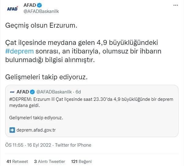 AFAD'dan yapılan açıklamada, "Geçmiş olsun Erzurum. Çat ilçesinde meydana gelen 4,9 büyüklüğündeki #deprem sonrası, an itibarıyla, olumsuz bir ihbarın bulunmadığı bilgisi alınmıştır" ifadelerini kullandı.