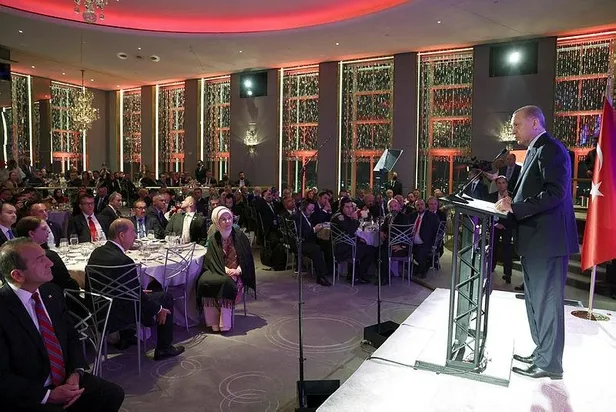 Yurt dışında yaşayanlarla birlikte nüfusu 95 milyonu bulan büyük bir ailenin mensupları olduklarını söyleyen Erdoğan, "Sizler diğer aidiyetleriniz yanında Türkiye'nin Amerika'daki gönül elçileri, milletimizin bu topraklardaki temsilcilerisiniz. Amerika'da, Türkiye'ye ve Türk insanına yönelik artan ilgide, sizlerin farklı alanlarda elde ettiği başarıların çok önemli payı bulunuyor. Ülkem ve milletim adına, sizlerin şahsına tüm vatandaşlarıma buradan teşekkür ediyorum." diye konuştu.
