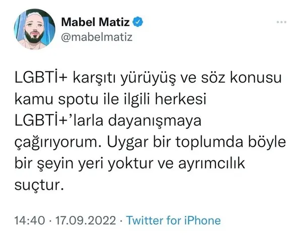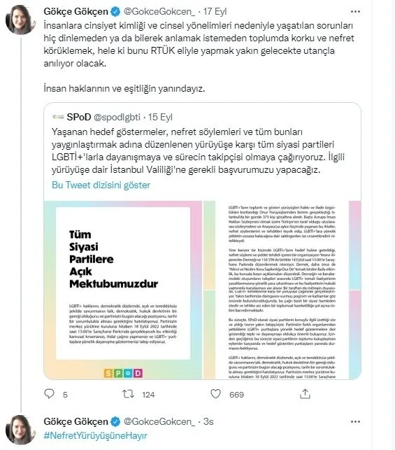 CHP Gençlik Politikalarından Sorumlu Genel Başkan Yardımcısı Gökçe Gökçen, sosyal medyadan LGBT'ye destek açıklamasında şunları söyledi: "İnsanlara cinsiyet kimliği ve cinsel yönelimleri nedeniyle yaşatılan sorunları hiç dinlemeden ya da bilerek anlamak istemeden toplumda korku ve nefret körüklemek, hele ki bunu RTÜK eliyle yapmak yakın gelecekte utançla anılıyor olacak. İnsan haklarının ve eşitliğin yanındayız."