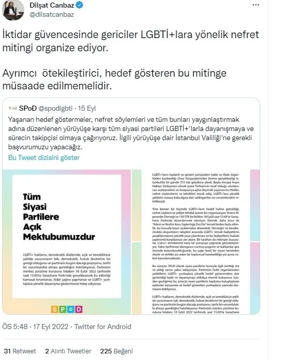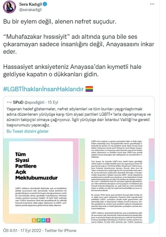 TİP İstanbul Milletvekili, Parti Sözcüsü Sera Kadigil de LGBT yürüyüşünü bir eylem olarak görmediğini şöyle dile getirdi: "Bu bir eylem değil, alenen nefret suçudur. "Muhafazakar hıssısiyit" adı altında şuna bile ses çıkaramayan sadece insanlığını değil, Anayasasını inkar eder. Hassasiyet anksiyeteniz Anayasa'dan kıymetli hale geldiyse kapatın o dükkanları gidin. #LGBTİhaklarıİnsanHaklarıdır"