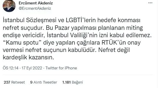 HDP Ekoloji Komisyonu Eş Sözcüsü Menekşe Kızıldere de sosyal medyadan şunları söyledi: "İnsanların varoluşları karşısında protesto düzenlemek nefret suçunu kitleselleştirmektir. Bu özgürlük değil, nefreti meşrulaştırmaktır. Bir grup insanın kalkıp kadın veya erkek karşıtı yürüyüş yapmasından farkı yoktur. LGBTI+ karşıtı yürüyüş nefretten başka bir şey değil."