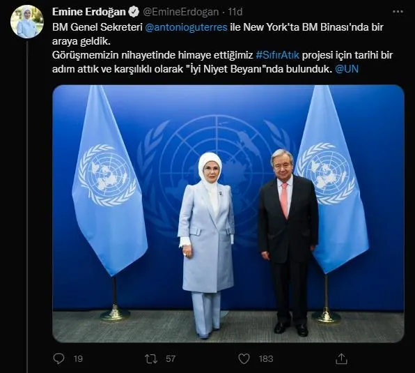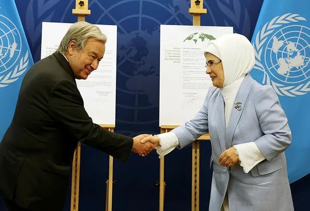 Emine Erdoğan ve Guterres, New York'taki BM Genel Merkezi'nde iklim kriziyle mücadele kapsamında Küresel Sıfır Atık İyi Niyet Beyanı'nı imzaladı. Bu çerçevede Emine Erdoğan'ın BM çatısı altında sıfır atığı hedefleyen çalışmanın küresel liderliğini yürüteceği belirtildi.