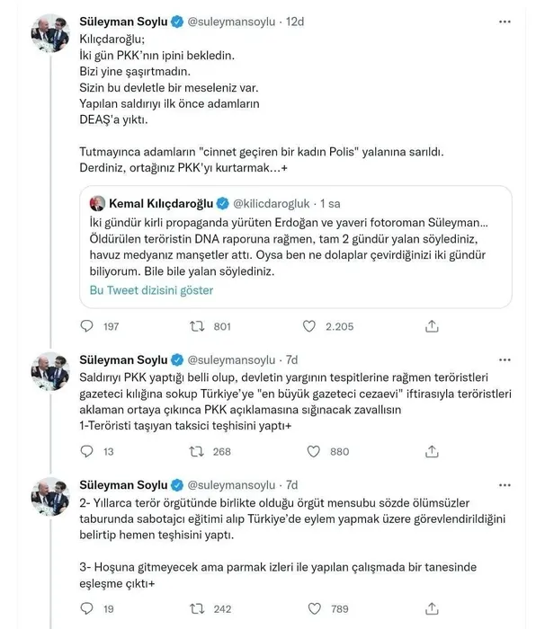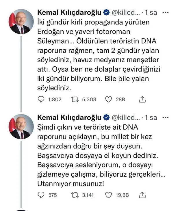 Kılıçdaroğlu; İki gün PKK'nın ipini bekledin. Bizi yine şaşırtmadın. Sizin bu devletle bir meseleniz var. Yapılan saldırıyı ilk önce adamların DEAŞ'a yıktı. Tutmayınca adamların "cinnet geçiren bir kadın Polis" yalanına sarıldı. Derdiniz, ortağınız PKK'yı kurtarmak...