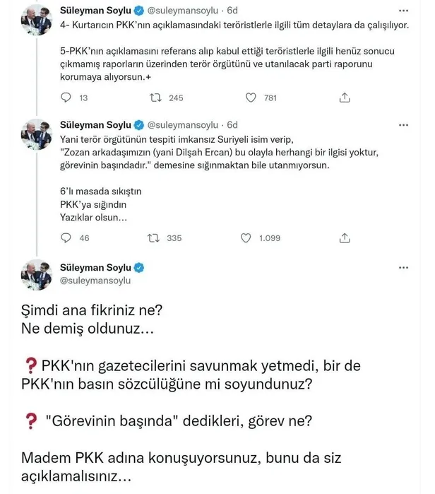Yani terör örgütünün tespiti imkansız Suriyeli isim verip, "Zozan arkadaşımızın (yani Dilşah Ercan) bu olayla herhangi bir ilgisi yoktur, görevinin başındadır." demesine sığınmaktan bile utanmıyorsun. 6'lı masada sıkıştın PKK'ya sığındın Yazıklar olsun...
