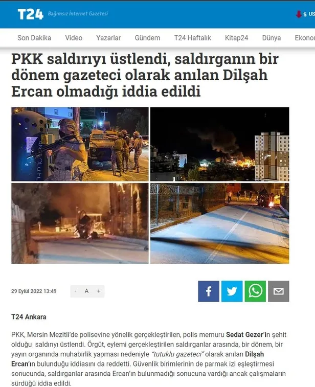 PKK Sözcülüğüne soyunan T24'te "PKK, Mersin Mezitli'de polisevine yönelik gerçekleştirilen, polis memuru Sedat Gezer'in şehit olduğu saldırıyı üstlendi. Örgüt, eylemi gerçekleştirilen saldırganlar arasında, bir dönem, bir yayın organında muhabirlik yapması nedeniyle "tutuklu gazeteci" olarak anılan Dilşah Ercan'ın bulunduğu iddiasını da reddetti" ifadeleri kullanıldı.