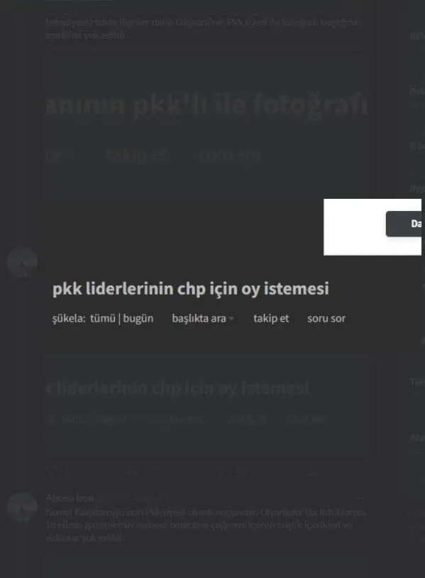 Terör örgütü PKK'nın elebaşı tarafından CHP'ye oy istenmişti. Bu başlık altındaki içerik ve linkler Ekşi Sözlük'te hızlı bir operasyon ile silindi.