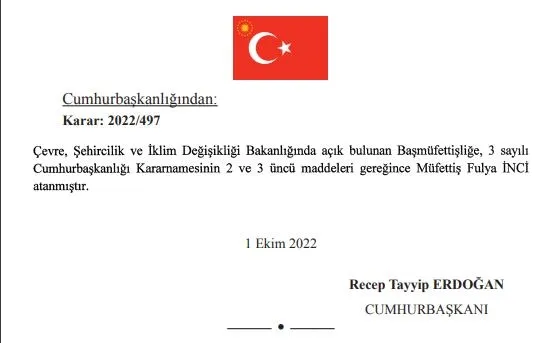 Çevre, Şehircilik ve İklim Değişikliği Bakanlığında açık bulunan başmüfettişliğe, müfettiş Fulya İnci atandı.