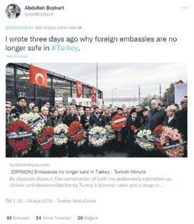Bozkurt, suikasttan 3 gün önce Twitter'dan "Türkiye'de artık elçilikler güvende değil" şeklinde paylaşım yaptı. Suikasttan hemen sonra ise FETÖ'nün suikasttaki rolünü örtbas etmek için manipülasyon çalışmaları yürüttü.