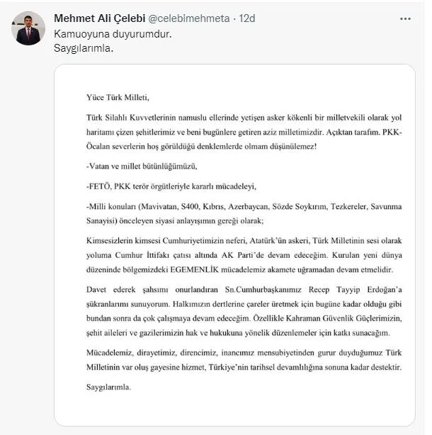 Son dakika haberine göre, Bağımsız Milletvekili olarak yoluna devam eden Mehmet Ali Çelebi yaptığı yazılı açıklama ile AK Parti'ye katıldığını duyurdu. Başkan Erdoğan'ın kendisini davet ettiğini belirterek şükranlarını sunan Çelebi, "Açıktan tarafım. PKK-Öcalan severlerin hoş görüldüğü denklemlerde olmam düşünülemez! Kurulan yeni dünya düzeninde bölgemizdeki EGEMENLİK mücadelemiz akamete uğramadan devam etmelidir. Halkımızın dertlerine çareler üretmek için bugüne kadar olduğu gibi bundan sonra da çok çalışmaya devam edeceğim." dedi.
