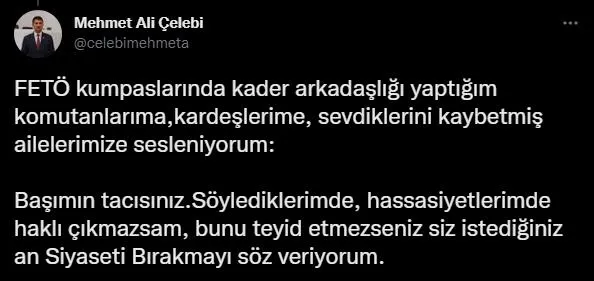 AK Parti'ye katıldığı için kendisini eleştirenlere sosyal medya hesabından cevap veren Çelebi, "FETÖ kumpaslarında kader arkadaşlığı yaptığım komutanlarıma, kardeşlerime, sevdiklerini kaybetmiş ailelerimize sesleniyorum: Başımın tacısınız. Söylediklerimde, hassasiyetlerimde haklı çıkmazsam, bunu teyid etmezseniz siz istediğiniz an siyaseti bırakmayı söz veriyorum." dedi.