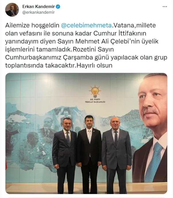 Çelebi'nin açıklamaları sonrası sosyal medyadan fotoğraf ve hoşgeldin mesajı paylaşan AK Parti Genel Başkan Yardımcısı Erkan Kandemir, "Ailemize hoşgeldin Mehmet Ali Çelebi,. Vatana, millete olan vefasını ile sonuna kadar Cumhur İttifakının yanındayım diyen Sayın Mehmet Ali Çelebi'nin üyelik işlemlerini tamamladık.