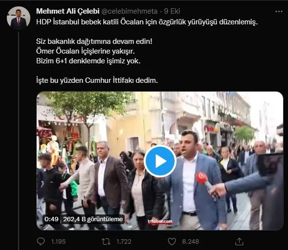 Teröristbaşı Öcalan'ı destekleyen HDP'ye tepki gösteren ve 6+1 denklemiyle ilgili tweet atan Çelebi, "HDP İstanbul bebek katili Öcalan için özgürlük yürüyüşü düzenlemiş. Siz bakanlık dağıtımına devam edin! Ömer Öcalan İçişlerine yakışır. Bizim 6+1 denklemde işimiz yok. İşte bu yüzden Cumhur İttifakı dedim." ifadelerini kullanmıştı.