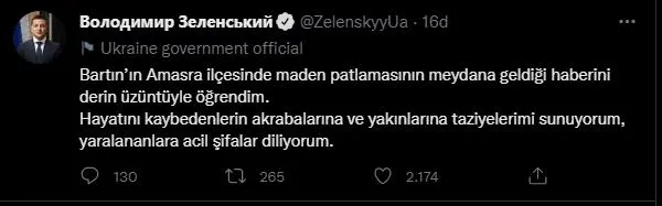 Ukrayna Devlet Başkanı Zelenskiy, sosyal medya hesabından taziye mesajı yayınladı. Zelenskiy, "Bartın'ın Amasra ilçesinde maden patlamasının meydana geldiği haberini derin üzüntüyle öğrendim. Hayatını kaybedenlerin akrabalarına ve yakınlarına taziyelerimi sunuyorum, yaralananlara acil şifalar diliyorum." dedi.