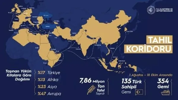 Ulaştırma ve Altyapı Bakanı Adil Karaismailoğlu, tahıl koridorunda taşınan yük miktarı ile ilgili yazılı açıklama yaptı. Karaismailoğlu, Ukrayna ve Rusya arasında yaşanan savaş sonrasında dünyada gıda krizinin yaşandığını ve bu krizin, Cumhurbaşkanı Recep Tayyip Erdoğan liderliğinde Türkiye'nin yürüttüğü başarılı diplomasi sonucu oluşturulan tahıl koridoru ile aşıldığını belirtti. Tahıl koridoru kapsamında, 1 Ağustos-18 Ekim tarihlerinde toplam 354 geminin; Ukrayna'nın Odesa, Çernomorsk ve Yuzni şehirlerindeki limanlardan yüklü olarak hareket ettiğini bildiren Karaismailoğlu, "Gemiler ile arpa, buğday, soya, ayçiçeği küspesi, buğday kepeği, bezelye, ayçiçeği çekirdeği, işlenmiş karışık gıda, şeker pancarı, ayçiçek yağı, kanola tohumu, mısır ve soya yağı olmak üzere 13 farklı çeşit yük taşındı" diye konuştu.