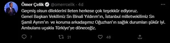 Çelik, sosyal medya hesabından, geçmiş olsun dileklerini ileten herkese teşekkür ederek, "Genel Başkanvekilimiz Sayın Binali Yıldırım'ın, İstanbul Milletvekilimiz Sayın Şamil Ayrım'ın ve koruma arkadaşımız Oğuzhan'ın sağlık durumları şükür iyi. Ambulans uçakla Türkiye'ye döneceğiz." ifadesini kullanmıştı.