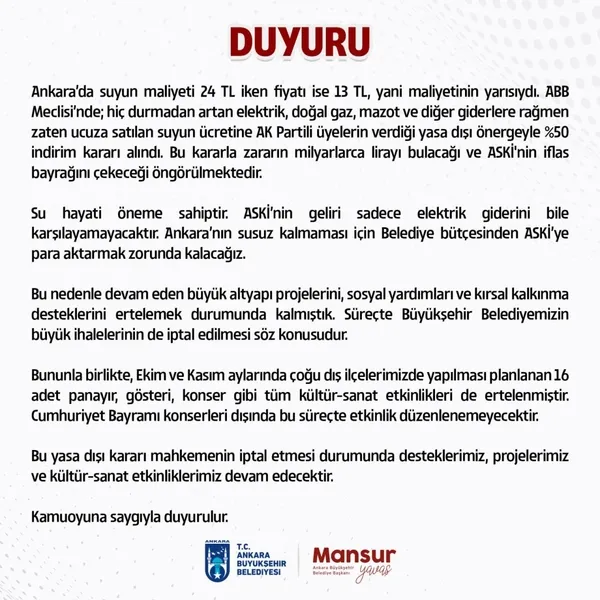 Ankara’da köylülerin su faturasına isyan etmesinin ardından Ankara Büyükşehir Belediyesi Meclisi’nde AK Parti’nin teklifiyle geçen ay oy çokluğuyla alınan “su tarifelerinde 12 Eylül'den itibaren yüzde 50 indirim yapılarak fiyatın sabitlenmesi ve 1 Ocak 2023'ten itibaren TÜFE oranında artış yapılmasına” kararı Başkan Mansur Yavaş’ı rahatsız etmişti. Suya yüzde 50 indirim kararı alınmasının ardından vatandaşa yapılan sosyal yardımları kesen CHP'li Ankara Büyükşehir Belediyesi büyük tepki çekerken belediyeden yeni bir açıklama daha geldi. Yapılan açıklamada, "ASKİ'nin iflas bayrağını çekeceği öngörülmektedir" ifadesi kullanıldı. Öte yandan ABB kırsal kalkınma desteklerini ve kültür-sanat etkinliklerini erteleyerek ihaleleri de iptal etti.