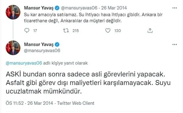 Yavaş'ın 2014 yılında ABB Başkanı Adayı olduğu dönemde, "Su kar amacıyla satılamaz. Su ihtiyacı hava ihtiyacı gibidir. Ankara bir ticarethane değil, Ankaralılar da müşteri değildir." yazdığı görüldü.