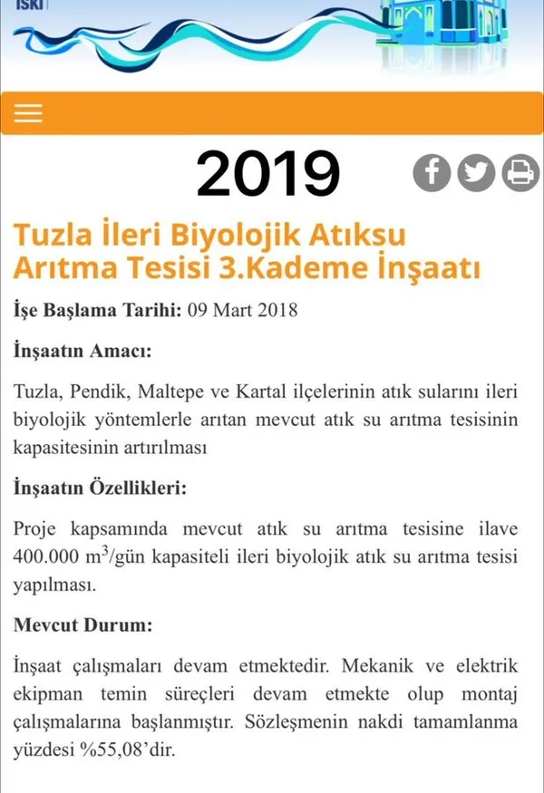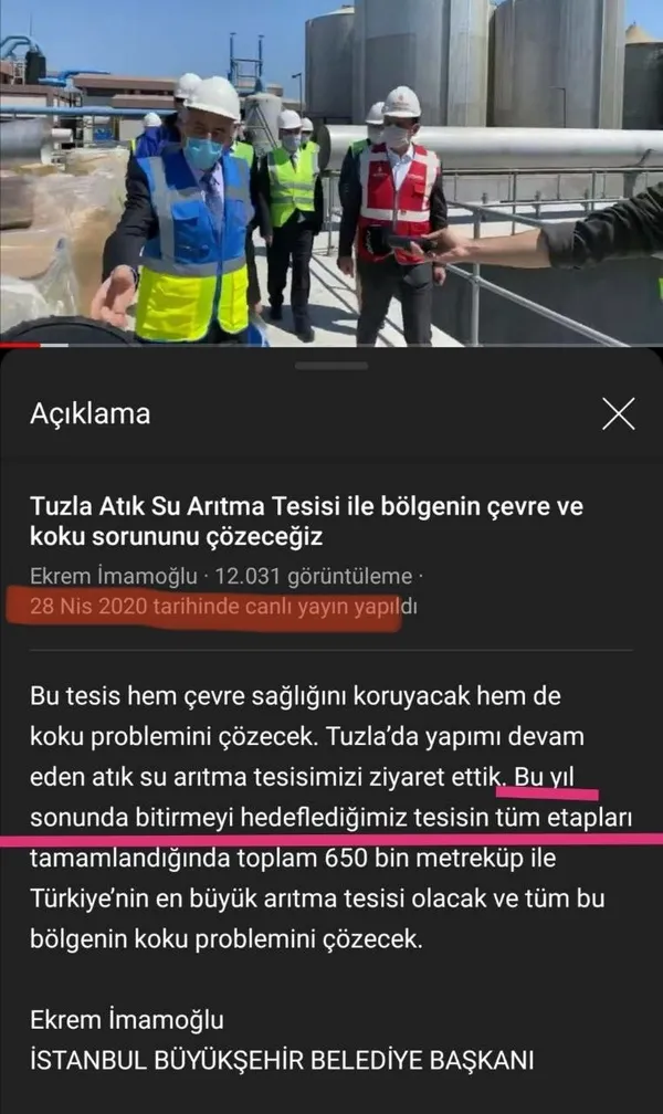 CHP'li İBB Başkanı Ekrem İmamoğlu'nun "%26 tamamlanma oranıyla teslim aldık" dediği Tuzla İleri Biyolojik Arıtma Tesisi 3. Etabı'nın, 2019'da %55'inin tamamlandığı ve açılışının 2 yıl gecikmeli olarak yapıldığı ortaya çıktı.