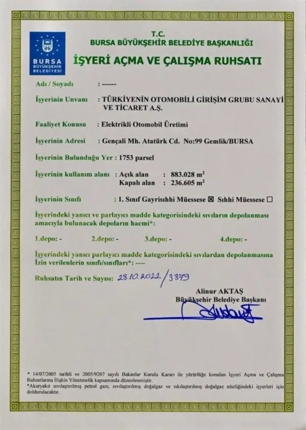 Gemlik ilçesinde 883 bin 28 metrekare ıçak alan 236 bin 605 metrekare kapalı alanda Elektrikli Otomobil Üretimi için kurulan fabrikanın ruhsatı da imzalanmış oldu. 28 Ekim tarihli 3879 nolu ruhsat fabrikanın resmi olarak çalışmasına imkan sağlıyor.
