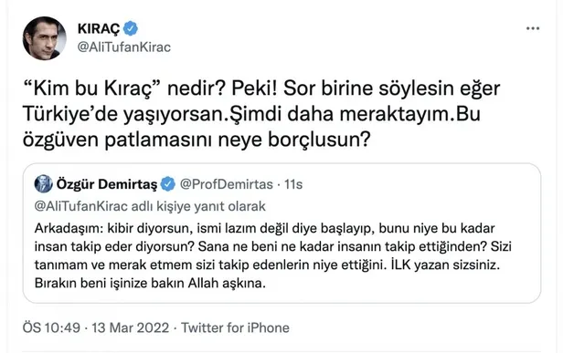 Özgür Demirtaş, Kıraç'a cevap veren tweet'inde şu ifadeleri kullandı.