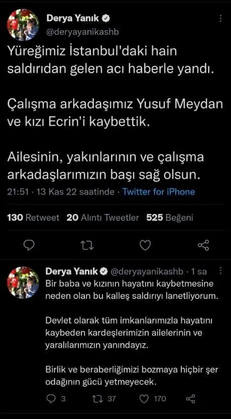 Son dakika haberi! İstiklal Caddesi'ndeki bombalı saldırıda Aile ve Sosyal Hizmetler Bakanlığı çalışanı Yusuf Meydan ve minik kızı Ecrin yaşamını yitirdi. Konuya ilişkin açıklama yapan Aile ve Sosyal Hizmetler Bakanı Derya Yanık, "Yüreğimiz İstanbul'daki hain saldırıdan gelen acı haberle yandı. Çalışma arkadaşımız Yusuf Meydan ve kızı Ecrin'i kaybettik. Ailesinin, yakınlarının ve çalışma arkadaşlarımızın başı sağ olsun. Bir baba ve kızının hayatını kaybetmesine neden olan bu kalleş saldırıyı lanetliyorum" dedi.