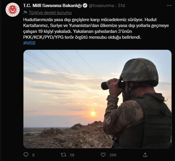 Yapılan açıklamada, "Hudutlarımızda yasa dışı geçişlere karşı mücadelemiz sürüyor. Hudut Kartallarımız, Suriye ve Yunanistan'dan ülkemize yasa dışı yollarla geçmeye çalışan 19 kişiyi yakaladı. Yakalanan şahıslardan 3'ünün PKK/KCK/PYD/YPG terör örgütü mensubu olduğu belirlendi." ifadelerine yer verildi.