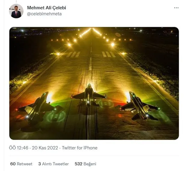 "Bir gece ansızın..." ifadelerini kullanan Çelebi, paylaşımında savaş jetlerinin fotoğraflarına yer verdi.