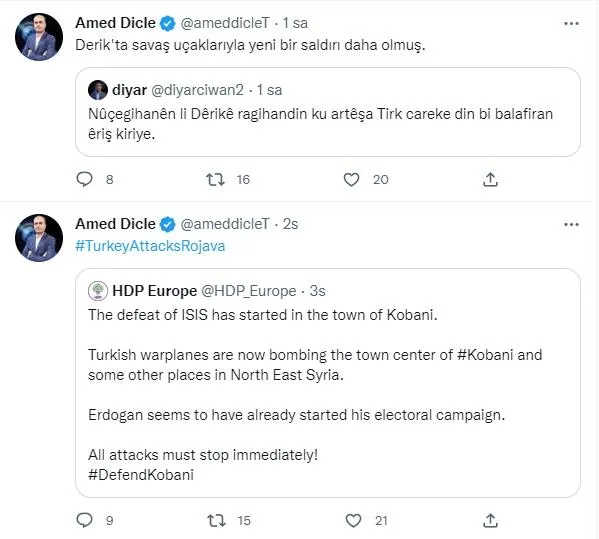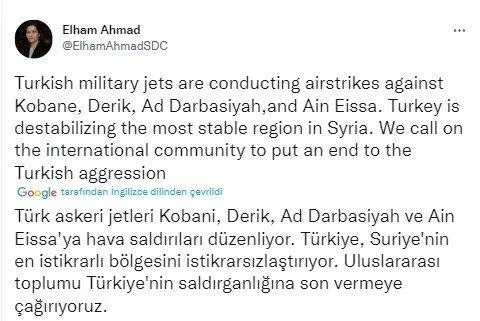 SDG Yürütme Kurulu Başkanı Elham Ahmad yaptığı açıklamada "Türk askeri jetleri Kobani, Derik, Ad Darbasiyah ve Ain Eissa'ya hava saldırıları düzenliyor. Türkiye, Suriye'nin en istikrarlı bölgesini istikrarsızlaştırıyor. Uluslararası toplumu Türkiye'nin saldırganlığına son vermeye çağırıyoruz." ifadelerini kullandı.