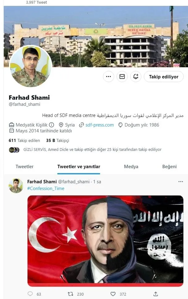 Terör örgütü PKK'nın bir başka kolu olan SDG'nin sözde sözcüsü Farhad Shami, rezil bir paylaşımda bulunarak kuyruk acısı olduğunu gözler önüne serdi.
