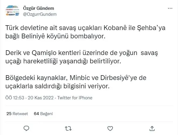 Terör örgütü PKK'nın medya ayağı ise sosyal medya platformları üzerinden dezenformasyona başladı. Yapılan paylaşımlarda "Türkiye sivilleri ve yerleşim yerlerini hedef alıyor" iftirası dolaşıma sokuldu.