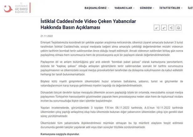 Emniyet Teşkilatımızla koordineli bir şekilde yapılan araştırma neticesinde; ülkemizi ziyaret amacıyla bulunan 3 turist tarafından İstiklal Caddesi'nde, sosyal medyada beğeni alma amacıyla çekildiği değerlendirilen mizahi videonun çekim tarihinin bombalı terör saldırısından önce olduğu tespit edilmiştir. Ancak videonun saldırıdan birkaç gün sonra paylaşılmış olması hem sorumsuzca hem de provokasyona açık bir paylaşım olarak değerlendirilmektedir.