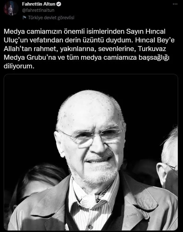 İletişim Başkanı Fahrettin Altun, "Medya camiamızın önemli isimlerinden Sayın Hıncal Uluç'un vefatından derin üzüntü duydum. Hıncal Bey'e Allah'tan rahmet, yakınlarına, sevenlerine, Turkuvaz Medya Grubu'na ve tüm medya camiamıza başsağlığı diliyorum." ifadeleriyle sosyal medyadan taziye mesajı yayınladı.