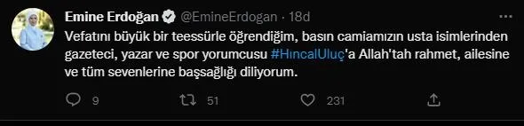 Emine Erdoğan, sosyal medya hesabından paylaştığı mesajında, "Vefatını büyük bir teessürle öğrendiğim, basın camiamızın usta isimlerinden gazeteci, yazar ve spor yorumcusu Hıncal Uluç'a Allah'tan rahmet, ailesine ve tüm sevenlerine başsağlığı diliyorum." ifadesini kullandı.