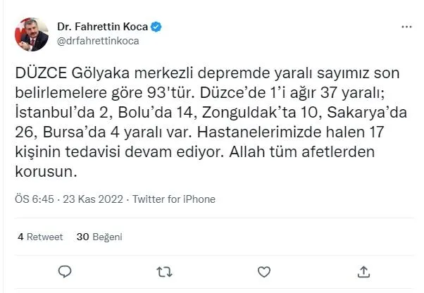 17 hastanın tedavisinin devam ettiğini bildiren Koca, "Düzce Gölyaka merkezli depremde yaralı sayımız son belirlemelere göre 93'tür. Düzce'de 1'i ağır 37 yaralı; İstanbul'da 2, Bolu'da 14, Zonguldak'ta 10, Sakarya'da 26, Bursa'da 4 yaralı var. Hastanelerimizde halen 17 kişinin tedavisi devam ediyor. Allah tüm afetlerden korusun" şeklinde konuştu.