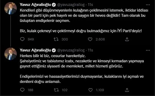 CHP'li Altay'ın kendisiyle ilgili açıklamalarına sosyal medya hesabından cevap veren Ağıralioğlu Altay ve CHP'nin siyasi anlayışını eleştirerek, "Kendileri gibi düşünmeyenlerin kulağının çekilmesini istemek, iktidar iddiası olan bir parti için pek hayırlı ve de saygın bir heves değildir! Tam olarak bu üsluptan endişelenir seçmen. Biz, kulak çekmeyi ve çektirmeyi doğru bulmadığımız için İYİ Parti'deyiz!" ifadelerini kullandı.