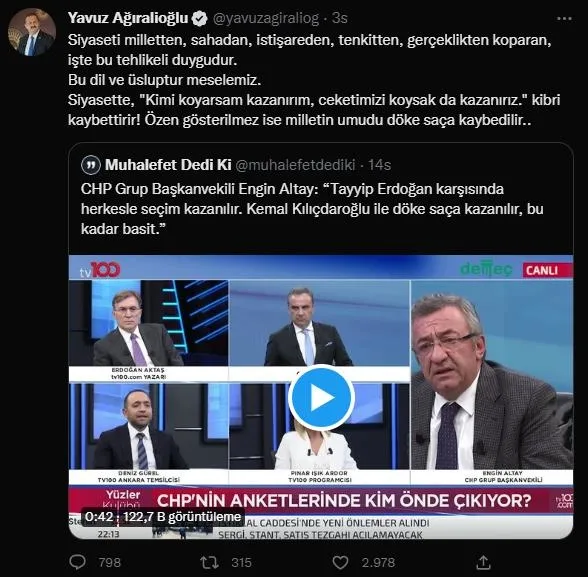 Altay'ın CHP Genel Başkanı Kemal Kılıçdaroğlu'nun adaylık açıklamalarıyla ilgili de tweet atan Ağırailoğlu, "Siyaseti milletten, sahadan, istişareden, tenkitten, gerçeklikten koparan, işte bu tehlikeli duygudur. Bu dil ve üsluptur meselemiz. Siyasette, "Kimi koyarsam kazanırım, ceketimizi koysak da kazanırız." kibri kaybettirir! Özen gösterilmez ise milletin umudu döke saça kaybedilir.." dedi.
