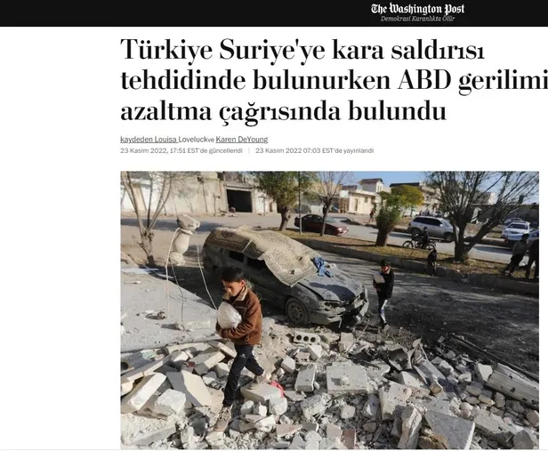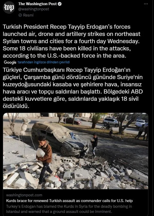 ABD'de yayın yapan The Washington Post gazetesi 23 Kasım 2022'de sosyal medyadan yayınladığı tweet ve haber paylaşımında, "Türkiye Cumhurbaşkanı Recep Tayyip Erdoğan'ın güçleri, Çarşamba günü dördüncü gününde Suriye'nin kuzeydoğusundaki kasaba ve şehirlere hava, insansız hava aracı ve topçu saldırıları başlattı. Bölgedeki ABD destekli kuvvetlere göre, saldırılarda yaklaşık 18 sivil öldürüldü." şeklindeki skandal ifadelerle Türkiye'yi hedef aldı.