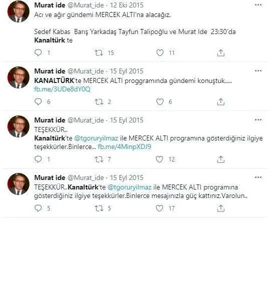 Meral Akşener'in danışmanı Murat İde'nin FETÖ ve FETÖ'cülerle ilgili çok sayıda tweeti ortaya çıktı. Murat İde'nin tweetlerinde FETÖ kurumlarına destek verdiği, FETÖ'cülerle içli dışlı olduğu görüldü. Murat İde'nin FETÖ tweetleri sosyal medyada gündem oldu. Zaman zaman çeşitli kanallar aracılığıyla destek tweetleri de yazan Murat İde'nin, FETÖ'nün kapatılan yayın organı KANALTÜRK'ün müdavimi olduğu görüldü.
