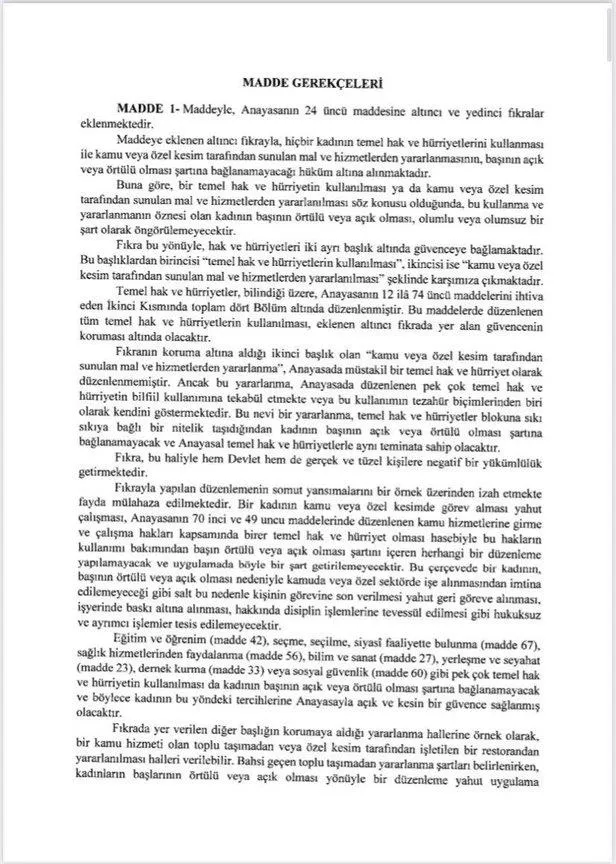 "Ülkemizin başı örtülü ve başı açık kadınları her türlü temel hak ve hürriyetini kullanabilmekte, kamu veya özel kesim tarafından sunulan mal ve hizmetlerden yararlanabilmektedir. Ancak dini inancı sebebiyle başını örten ve kıyafet tercihinde bulunan kadınların; yasal ve idari düzenlemeler veya fiili uygulamalarla, insan onuruyla bağdaşmayan, Anayasa'ya aykırı, ayrımcı ve çağ dışı uygulamalara bir daha maruz bırakılmamaları amacıyla anayasal güvence getirilmektedir."